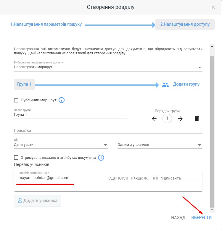 Оберіть тип налаштування доступу «Налаштувати маршрут» та дію «Делегувати». Натисніть кнопку «Додати учасника».